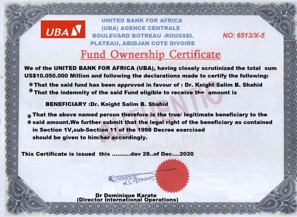 Here are some certificates given by Dr. Adams Yeha by email. I hope everything will be true very soon to give me my 10,050,000 million usd. In the certificate there are errors in Bank address and no mention of corresponding bank’s names. Dr. Adams Yeha told he would correct those and send those soon. Thus I will possess my 10,050,000 million usd and also use that money.