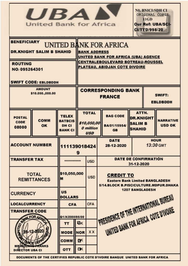 On 20 September, 2023, Wednesday I talked to Dr. Adams Yeha, director of Beck Security, Ivory Coast. We decided that Dr. Adams Yeha would tranfer $10,050,000 millions usd to my US bank account and he would also give me the custom clearance certificate and documents of sending money from late Ms. Halgen Toh of his first physical sent coded 1.5 millions usd. Those money will be used for my personal use and for my businesses. For transferring $10,050,000 millions usd he would spend $900 usd and for giving me the previously given 1.5 millions usd coded money’s custom clearance certificate and certificate of transfer from late Ms. Halgen Toh he would spend $650. That $1450 usd has be raised by him. Then he will transfer $10,050,000 millions usd to my US bank account and also send me documents so that I can deposit coded 1.5 millions usd given to me to any Bangladeshi banks and he will also give SSD fluid to clean 1.5 million usd black coated notes. As a part of negotiation of transfer, I and Dr. Adams Yeha decided that after transferring $10,050,000 millions usd successfully to my US bank account, I will give 10% of $10,050,000 millions usd to Dr. Adams Yeha by transferring it to his given account.